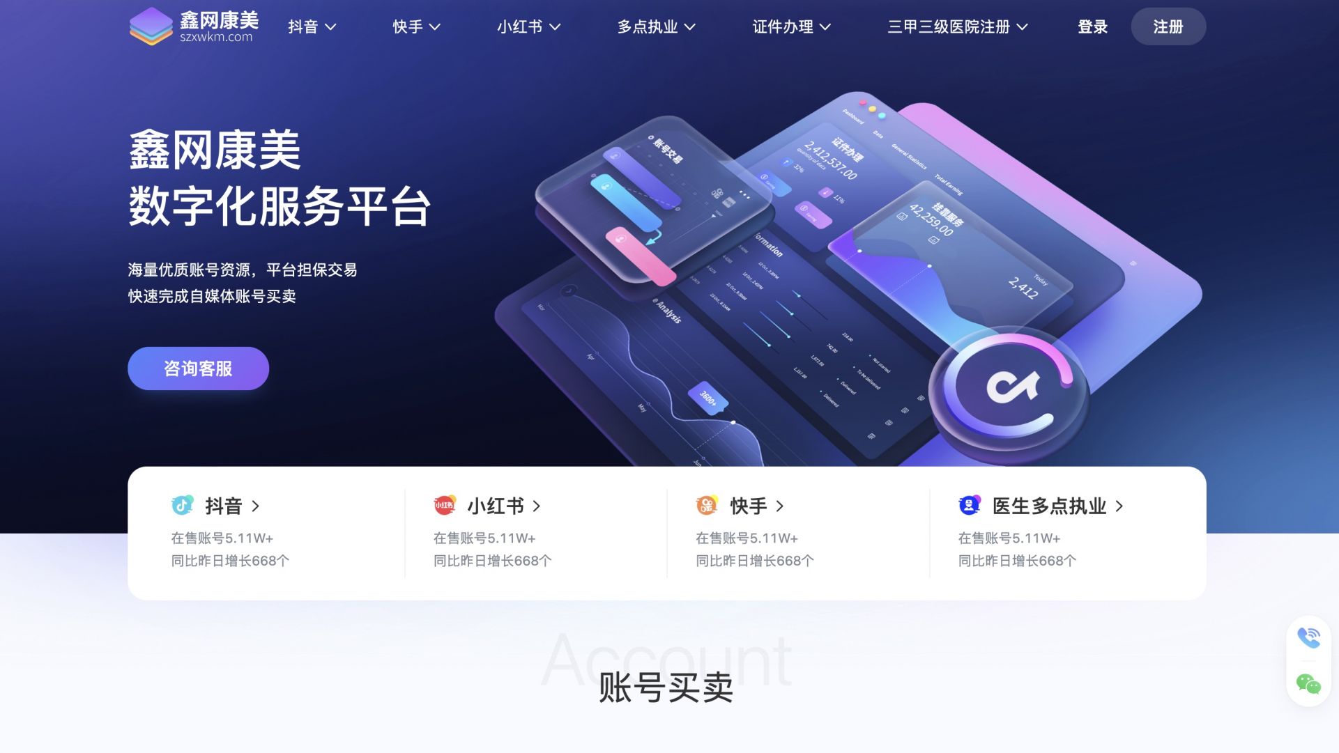 熱烈慶祝深圳鑫網(wǎng)康美科技有限公司平臺定制完成并上線!深圳鑫網(wǎng)康美科技有限公司專注于抖音、快手、小紅書、視頻號、今日頭條、微博、百家號等自媒體平臺各類賬號的交易、買賣。