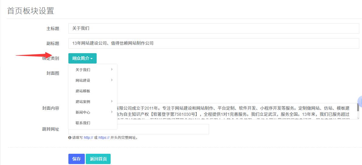 2. 在右側【首頁版塊設置】點擊【綁定類別】,選擇關于我們
