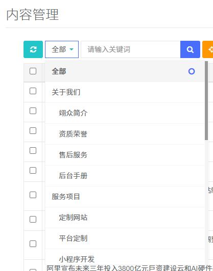 2.在右側(cè)【內(nèi)容管理】點(diǎn)擊【全部】,在下拉菜單選擇欄目名稱,點(diǎn)擊【搜索】
