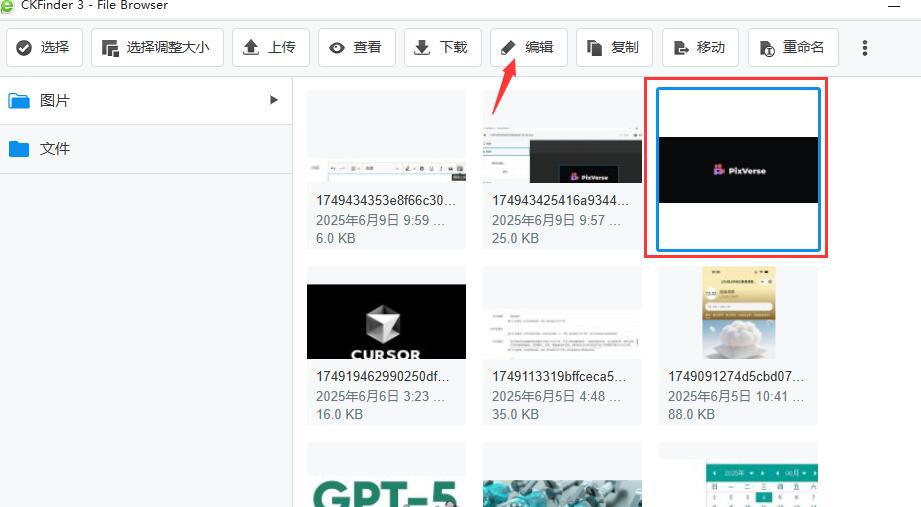 2.在展開的圖片文件夾中選擇需要裁剪的圖片,點(diǎn)擊上方工具欄的【編輯】