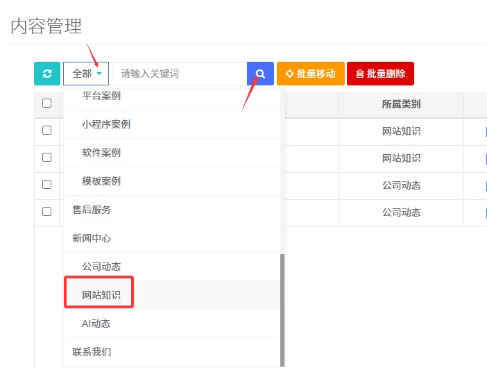 2.進入【內(nèi)容理】,點擊【全部】,選擇【網(wǎng)站知識】,點擊右側【放大鏡搜索】