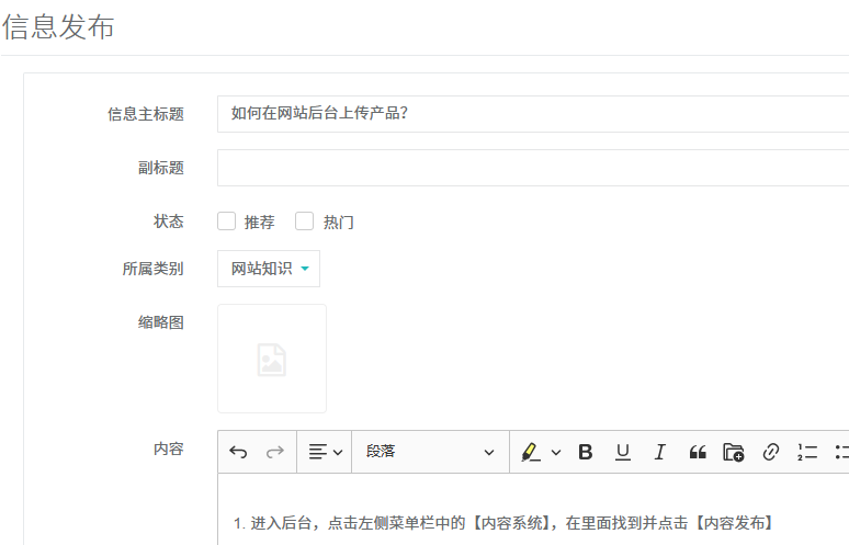 2.進(jìn)入信息發(fā)布按照頁(yè)面指引填寫(xiě)產(chǎn)品名稱,副標(biāo)題、選擇所屬產(chǎn)品分類、上傳縮略圖、產(chǎn)品內(nèi)容詳細(xì)圖文介紹等相關(guān)信息