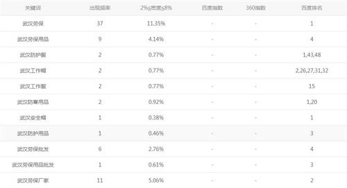 從截圖中可以看到“武漢勞?!边@個詞的密度遠遠大于8%的,在百度中的排名是第一名;“武漢安全帽”這個詞的密度只有0.38%也遠遠小于2%,在百度中的排名同樣是第一名,當然一個案例不能說明什么,也不能就此推斷2%-8%的原則就是錯的,在這里只是想說明一點,做SEO優(yōu)化,不能單純的認為哪一個可行,哪一個就一定不行。要看結(jié)果,更要看其內(nèi)容的價值。作為SEO站長,如果是新手,建議還是從關(guān)鍵詞密度開始,因為新手站長往往無法更好的把握網(wǎng)站基調(diào),在優(yōu)化過程中,不能快速的做上去。而這對于新手站長來說是不利的,畢竟老板還要看結(jié)果的。