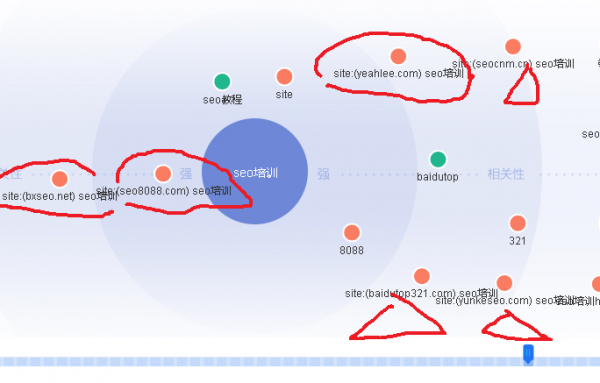 圓形圈起來(lái)的,在圖譜中存在的時(shí)間比較短,來(lái)回動(dòng)一下橫條的時(shí)間表查看,這幾個(gè)站沒(méi)有任何排名。而三角形指出來(lái)的幾個(gè)域名卻長(zhǎng)期存在于需求圖譜中,拉動(dòng)橫條可以看到這幾個(gè)域名雖然位置變動(dòng)了,但是依然存在靠中心的位置,這幾個(gè)站一直排在SEO培訓(xùn)首頁(yè)。